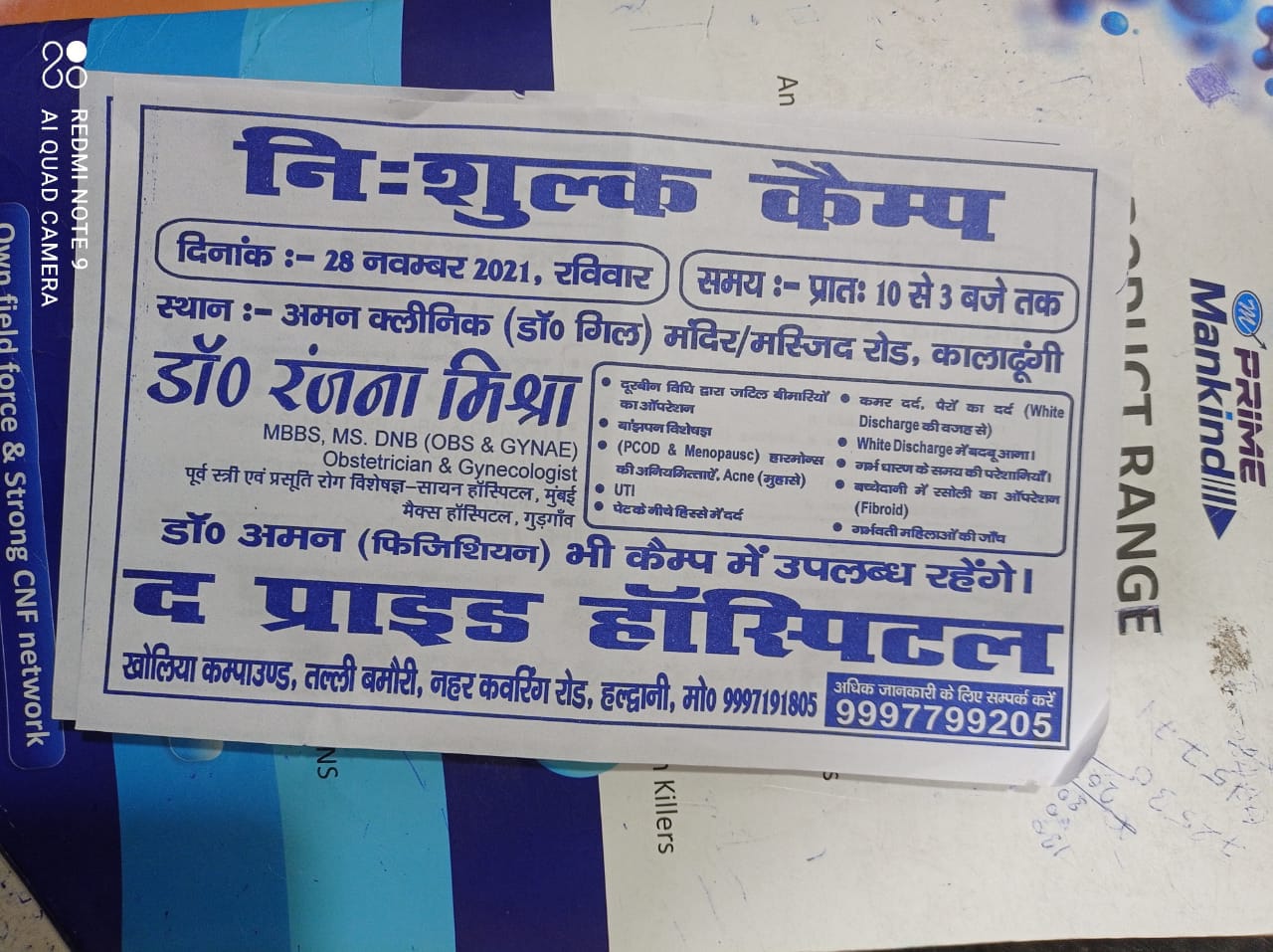 कालाढूंगी। (शाकिर हुसैन) अमन क्लिनिक में निःशुल्क स्वास्थ्य कैम्प का आयोजन किया जाएगा।डॉक्टर गिल ने जानकारी देते हुए बताया कि 28 नवम्बर रविवार को मंदिर मस्जिद मार्ग कालाढुंगी में अमन क्लीनिक में एक निषुल्क सुवास्थ कैम्प लगाया जा रहे । कैम्प में द प्राइड हॉस्पिटल हल्द्वानी वरिष्ठ स्त्री रोग विशेषज्ञ डॉक्टर रंजना मिश्रा द्वारा महिलाओं को निःषुल्क देखा जाएगा व उनके उचित परामश भी दिया जाएगा जिसका कोई सुल्क नही लिया जाएगा।वही फिजिशियन डॉक्टर अमन,व डॉक्टर गिल द्वारा भी कैम्प में आने वाले रोगियों को निषुल्क देखा जाएगा।उन्होंने कहा उचित दरों पर खून की समस्त जांचे सहित ई,सी,जी,व डिजिटल एक्सरे भी किए जाएंगे।