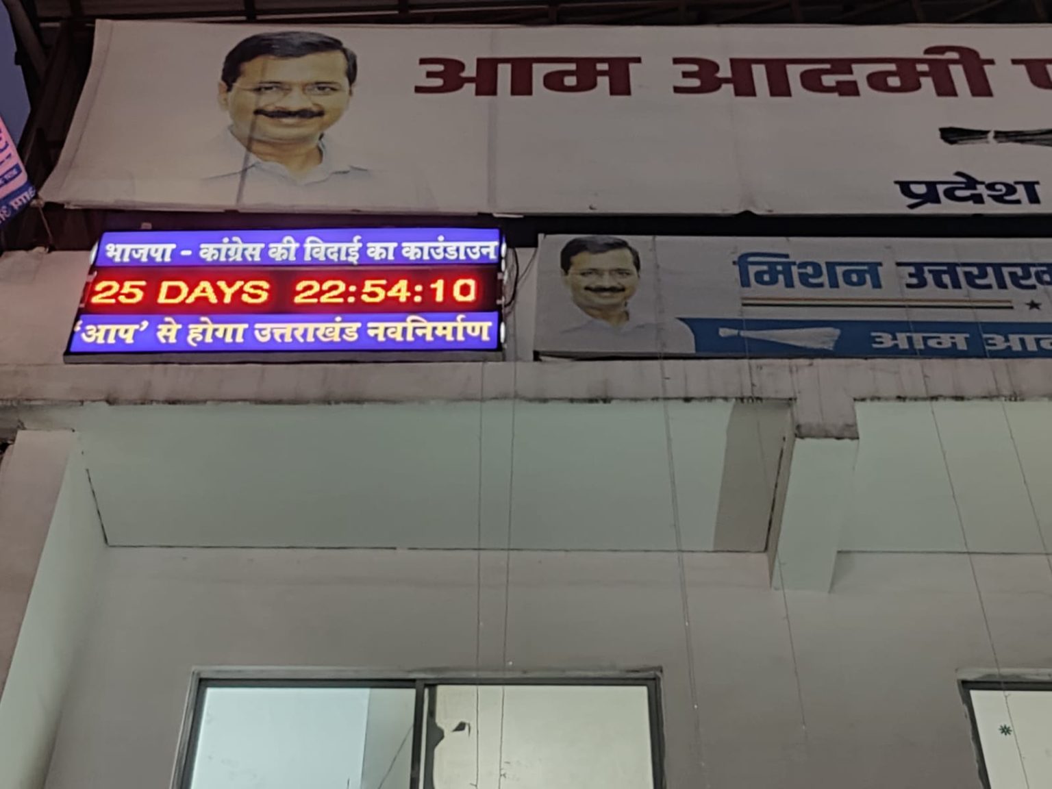 देहरादून: उत्तराखंड में 14 फरवरी को चुनाव होने हैं जिसका काउंटडाउन शुरू हो चुका है और प्रदेश की जनता नए विकल्प के लिए पूरी तरीके से तैयार है। आम आदमी पार्टी ने भी प्रदेश कार्यालय के बाहर में कांग्रेस बीजेपी की विदाई के लिए अब काउंटडाउन की घड़ी लगा दी है ।प्रदेश कार्यालय के बाहर बड़ी क्लॉक आप ने लगाई है जिसमें समय के साथ विदाई दिखाया जा रहा है । आप मीडिया सह प्रभारी उमा सिसोदिया ने बताया कि यह काउंटडाउन घड़ी उन दोनों ही पार्टियों के लिए एक सबक है जिन्होंने 21 साल रहते हुए इस राज्य को सिर्फ बर्बाद करने का काम किया है। इस घड़ी में जहां चुनाव की तारीख दिखाई दे रही है वही यह घड़ी काउंट डाउन का समय भी बता रही है ।