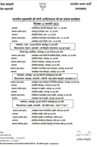 इस बार भी उनका कार्यक्रम तय हो चुका है। योगी भाजपा के बड़े स्टार प्रचारक हैं।योगी 12 फरवरी को भाजपा के टिहरी उम्मीदवार किशोर उपाध्याय, कोटद्वार से भाजपा उम्मीदवार ऋतु खंडुरी और रुड़की से भाजपा उम्मीदवार प्रदीप बत्रा के लिए वोट मांगेगे तथा जनता को संबोधित करेंगे । उत्तरप्रदेश के सीएम योगी आदित्यनाथ के प्रोग्राम इस प्रकार हैं।