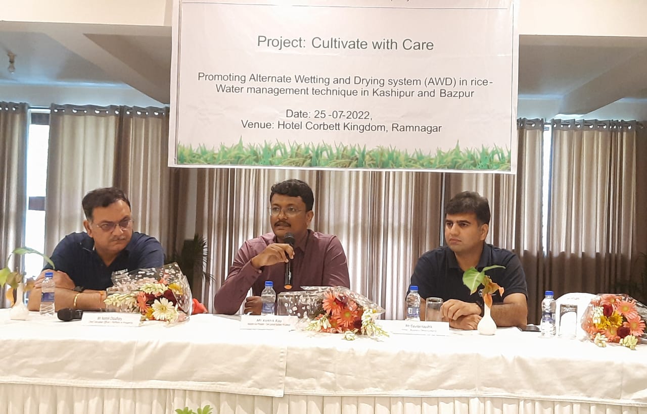 रामनगर। पार्टनर्स इन प्रोस्पेरिटी एनजीओ द्वारा कल्टीवेट विथ केयर अभियान, काशीपुर और बाजपुर में प्रारंभ किया जा रहा है जिसका मकसद किसानों को इससे रूबरू कराते हुये किसानों के साथ इससे जुड़ी जानकारियों को साझा किया गया। कल्टीवेट विथ केयर (CWC) क्या है। देश के कई हिस्सों में चावल प्रमुख फसल है जिसपर वैश्विक खाद्य सुरक्षा भी निर्भर करती है । अंतर्राष्ट्रीय धान अनुसंधान संस्थान और तेलंगाना राज्य कृषि विश्वविद्यालय के प्रोफेसर जयशंकर ने कृषि के लिए बढ़ते जल की कमी और पर्यावरणीय चिंताओं को देखते हुए जल संरक्षण तकनीको का विकास किया है। एकांतर गीला और सूखा उन जल कुशल तकनीकों में से एक है । पार्टनर्स इन प्रोस्पेरिटी एनजीओ, एक गैर सरकारी संस्था जिसका मुख्यालय दिल्ली में स्थित है, पिछले कुछ वर्षों से 6000 से अधिक किसानो के साथ जैविक कृषि, फेयर ट्रेड, जल संचयन, गोबर गैस संयंत्रों की स्थापना, कौशल विकास के कार्यक्रम, और समुदाय आधारित कार्यक्रमों के साथ सामुदायिक सशक्तिकरण के लिए कार्य कर रही है । हमारी आपूर्ति श्रंखला और सामाजिक व पर्यावरणीय विशेषज्ञ 14 राज्यों में सुनिश्चित करते हैं की वस्तुओं की नैतिक सौर्सिंग हो जो पर्यावरण और लोगो के हित में हो । इसी उद्देश्य के साथ पार्टनर्स इन प्रोस्पेरिटी “कल्टीवेट विथ केयर” अभियान की शुरुआत कर रहा है जिसमे, काशीपुर और बाजपुर क्षेत्र के धान की खेती में AWD तकनीक को बढ़ावा दिया जायेगा । एकांतर गीला और सूखा पद्यति क्या है। धान की खेती में जल प्रबंधन की एक तकनीक जो सिंचित धान की समतल नीची भूमि को कम जल से सिंचित करने में सहायक है और साथ ही कम मात्रा में ग्रीन हाउस गैस उत्सर्जित करती है । इसमें, सिंचाई जल तब लगाया जाता है जब खेतो में सिंचित जल पूरी तरह से इस्तेमाल कर लिया जाता है ।