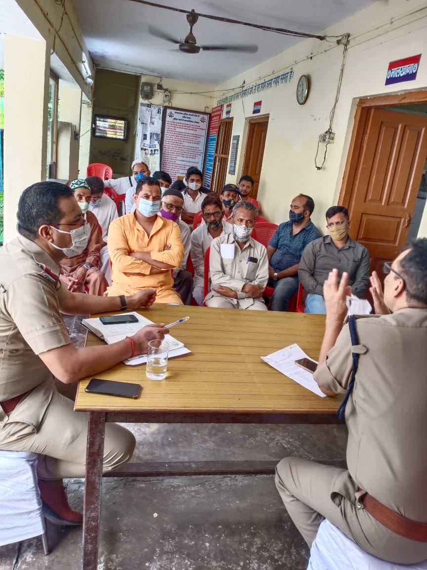 कालाढुंगी।(शाकिर हुसैन) पुलिस उपाधीक्षक रामनगर तथा थानाध्यक्ष कालाढूंगी द्वारा समस्त धार्मिक स्थलों मंदिरों, मस्जिदें, गुरुद्वारा व चर्च के प्रबंधकों एवं मुख्य पुजारियों की मीटिंग ली गई, जिसमें श्रीमान क्षेत्राधिकारी महोदय द्वारा धार्मिक स्थलों मैं प्रयोग किए जा रहे ध्वनि संयंत्रों लाउडस्पीकर आदि के संबंध में माननीय उच्च न्यायालय के निर्देशों का पूर्णता पालन किए जाने हेतु निर्देशित किया गया। धार्मिक स्थलों में प्रयोग किए जाने वाले ध्वनि संयंत्रों को बिना प्रशासन की अनुमति के ना लगाने एवं ध्वनि संयंत्रों की ध्वनि की तीव्रता माननीय उच्च न्यायालय के आदेश के अनुरूप रखे जाने हेतु दिशा निर्देश दिए गए तथा धार्मिक स्थलों मैं दर्शन एवं पूजा अर्चना के लिए आने वाले श्रद्धालुओं को कोविड-19 के दिशानिर्देशों का पूर्णतया पालन कराने हेतु कहा गया श्रीमान क्षेत्राधिकारी महोदय द्वारा मीटिंग में आए समस्त धार्मिक स्थल के प्रबंधकों को उक्त संबंध में स्थानीय पुलिस से समय-समय पर आपसी समन्वय व संपर्क रखने हेतु भी कहा गया इस दौरान जामा मस्जिद सदर वकील अहमद,मो,मेहताब,हाजी जलील ,सहित अनेक लोग मौजूद थे।