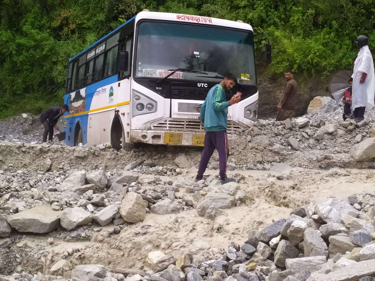 पहाड़ी से अचानक मलवा आने से फंसी बस।