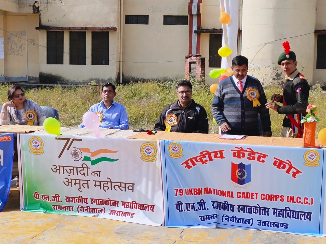 रामनगर।राजकीय स्नातकोत्तर महाविद्यालय रामनगर में 73वां एनसीसी दिवस बड़े ही धूमधाम व हर्षोल्लास से मनाया गया।एनसीसी दिवस के अवसर पर 79 यूके. एवं 24गर्ल्स बटालियन द्वारा सांस्कृतिक कार्यक्रमों का आयोजन किया गया। कार्यक्रम का शुभारंभ प्रभारी प्राचार्य डॉ.जी.सी.पंत ने किया।आजादी के अमृत महोत्सव पर वीर शहीदों को स्मरण करते हुए एनसीसी प्रभारी डॉ.डी.एन.जोशी ने एनसीसी के महत्व,उद्देश्यों एवं लक्ष्यों को धारण कर राष्ट्र सेवा में तत्पर रहने की अपील की।डॉ.सुमन कुमार ने एकता और अनुशासन का पालन कर भारत राष्ट्र की सैन्य महाशक्ति बनकर आगे आने की बात कही। लेफ्टिनेंट(डॉ.)कृष्णा भारती ने एनसीसी दिवस की बधाई दी। एनसीसी के छात्र छात्राओं ने बड़े उत्साह से विभिन्न सांस्कृतिक कार्यक्रम प्रस्तुत किए।कमलजीत सिंह ने देशभक्ति गीत, धर्मेंद्र कुमार ने कुमाउँनी गीत,ममता ग्रुप द्वारा समूह गीत प्रस्तुत किया गया।भावना, मेघा,वन्दना, श्रुति हाल्सी ने कुमाऊँनी एवं गढ़वाली लोकगीतों पर नृत्य किया।सोलो डान्स में रचना ने शास्त्रीय संगीत पर सभी को मंत्रमुग्ध कर दिया।इन्दु,नीशु व आरती ग्रुप ने पंजाबी डान्स प्रस्तुत किये।राहुल रिखाड़ी,हर्षित बिष्ट व संजना बिष्ट ने अपने विचार व्यक्त किए। प्राचार्य प्रो.पन्त ने समस्त कैडेट्स को उनके द्वारा प्रस्तुत कार्यक्रमों की सराहना की।उन्होंने विद्यार्थियों से शिक्षा के साथ साथ एनसीसी में भी राष्ट्रीय स्तर पर कीर्तिमान स्थापित करने की आशा व्यक्त की।मंच संचालन ममता व हिमानी निगल्टिया ने संयुक्त रूप से किया।