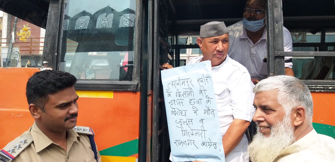 काले कृषि कानूनों के खिलाफ लखीमपुर खीरी में शांतिपूर्वक प्रदर्शन कर रहे किसानों को केंद्रीय गृह राज्य मंत्री अजय मिश्र के बेटे की गाड़ी द्वारा रौदकर की गयी किसानों की हत्या के विरोध में आज प्रदेश कांग्रेस कमेटी के कार्यकारी अध्यक्ष रणजीत रावत के नेतृत्व मे काली पट्टी बांध एवं मौन धारण कर कार्यालय से रानीखेत रोड, मुख्य बाजार होते हुए रामनगर कोतवाली में गिरफ्तारी दी। इस दौरान रणजीत रावत ने कहा कि जिस तरीके से पहले केंद्रीय गृह राज्य मंत्री का बयान आता है की किसान सुधर जाएं वरना हम उनको ठीक कर देंगे और कल उनके बेटे द्वारा सांस्कृतिक रूप से प्रदर्शन कर रहे किसानों को पीछे से अपनी कार से रौदा जाता है। किसानों की हत्या की जाती है और हमारी पार्टी की राष्ट्रीय महासचिव प्रियंका गांधी को घटनास्थल से जाने से रोका जाता है। और उनको गिरफ्तार किया जाता है। उन सब के विरोध में कांग्रेस कार्यकर्ताओं ने पूरे प्रदेश में काली पट्टी पहन मौन जुलूस निकालकर अपनी गिरफ्तारी दी है। उसी के तहत रामनगर कोतवाली में भी कांग्रेस कार्यकर्ताओं ने गिरफ्तारी दी है। गिरफ्तारी देने वालों में नगर अध्यक्ष डीसी हर्बोला, ब्लॉक अध्यक्ष मालधन ओम प्रकाश, चेयरमैन हाजी मोहम्मद अकरम, कांग्रेस प्रदेश महामंत्री किशोरीलाल, प्रदेश कांग्रेस कमेटी के सदस्य नरेश कालिया, वरिष्ठ प्रदेश उपाध्यक्ष अनु0 विभाग गिरधारी लाल, जिला उपाध्यक्ष अनिल अग्रवाल खुलासा, प्रदेश सचिव अनु0 विभाग ममता आर्य, उप ग्राम प्रधान लीलाधर जोशी, सभासद गुलाम सादिक, सभासद मोहम्मद मुजाहिद, पलविंदर सिंह बंटी, हरपाल सिंह, गुरप्रीत सिंह, कुंदन नेगी, सरिता टम्टा, मंजू रेकुनी, ताईफ खान, दीपक जोशी, धारा बल्लभ पांडे, ओम प्रकाश आर्य वंशी, नदीम कुरेशी, शकील अहमद, पंकज सुयाल, कुंदन नेगी, महेंद्र आर्य, बिट्टू राणा, अतुल अग्रवाल, नवीन सनवाल, सुनील टंम्टा, भुवन चंद्र, चंदन, नवीन सुनेजा, नजाकत अली, चांद खान, प्रयाग चंद्र राजेश नेगी, महेंद्र प्रताप सिंह बिष्ट, सुमित तिवारी, रवि ठाकुर, मोहम्मद शोएब, प्रकाश बेलवाल, शुभम खेरिया, आफाक हुसैन, जीत खेरिया, कमल नेगी, कुबेर कड़ाकोटि, गुरवन्त सिंह, बिट्टू राणा, अजय मेहता, दीप पान्डे, कैलाश त्रिपाठी, प्रेम जैन, निकेश देवल आदि रहे।