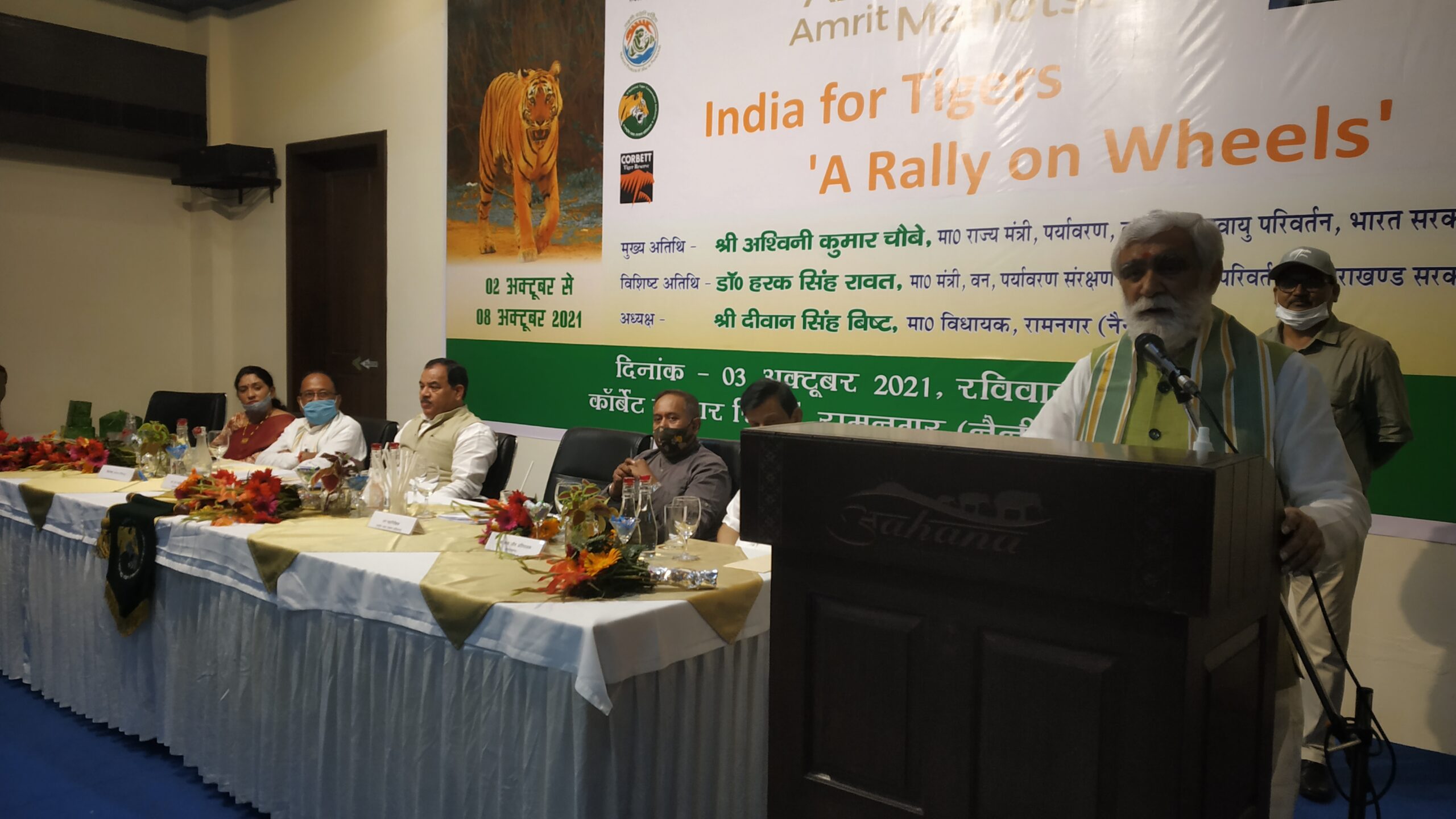 रामनगर। राष्ट्रीय बाघ संरक्षण प्राधिकरण द्वारा स्वतंत्रता के 75 वें साल पर आयोजित अमृत महोत्सव का कॉर्बेट के लिए समापन हो गया। हालांकि एन टी सी ए का यह कार्यक्रम 2 अक्टूबर से 8 अक्टूबर तक चलेगा। इस मौके पर वन एवं पर्यावरण केंद्रीय राज्यमंत्री अश्विनी कुमार चौबे ने भी शिरकत की। इस दौरान उन्होंने कहा कि वन विभाग के अधिकारी और कर्मचारी भी तन्मयता से वन्यजीवों और पर्यावरण की रक्षा में लगे हुए हैं। ऐसे में वह इन कार्मिकों को भी पुलिस की तर्ज पर राष्ट्रपति पदक देने का राष्ट्रपति से अनुरोध करेंगे। उन्होने बाघ संरक्षण के लिए बजट कम होने पर कोरोना का हवाला दिया, और कहा कि जैसे ही स्थितियां अनुकूल होंगी तो बजट बढ़ा दिया जाएगा। उन्होने कहा कि एन टी सी ए का इंडिया फ़ॉर टाइगर- ए रैली ऑन व्हील्स का यह कार्यक्रम देश भर के टाइगर रिजर्व में आयोजित किया जाएगा।