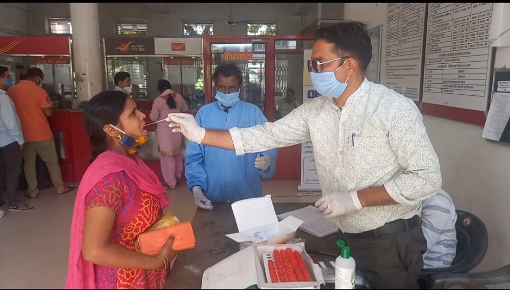 रामनगर। (नाजिम सलमान) कोरोना काल के चलते लोकडाउन का उल्लंघन करने वालों के खिलाफ स्वास्थ्य विभाग व पुलिस प्रशासन ने अभियान चलाया गया।सोमवार को रामनगर के डाक विभाग में आने-जाने वाले लोगों की स्वास्थ्य विभाग द्वारा एंटीजेन टेस्टिंग व आरटीपीसीआर जांच अभियान चलाया गया।डाक विभाग के प्रबंधक प्रवीण बंसीयाल ने बताया कि पिछले कुछ दिनों से डाकघर में अपने निजी कार्या के चलते लोगों की लंबी लाइन लग रही है। जिससे कोरोना के संक्रमण का खतरा बराबर बना रहता है।कोरोना सक्रमण के खतरे को देखते हुए स्वास्थ्य विभाग द्वारा डाक विभाग में आने-जाने वाले लगभग सौ लोगों की एंटीजेन टेस्टिंग व आरटीपीसीआर जांच की गई।जिसमें दो लोग संक्रमित पाये गए हैं।